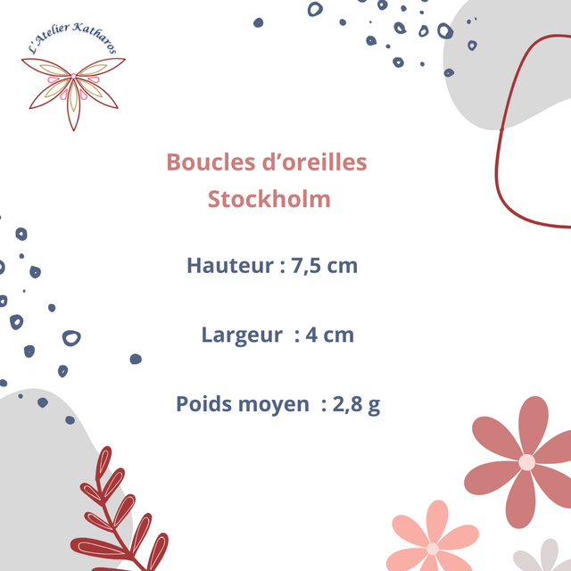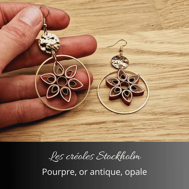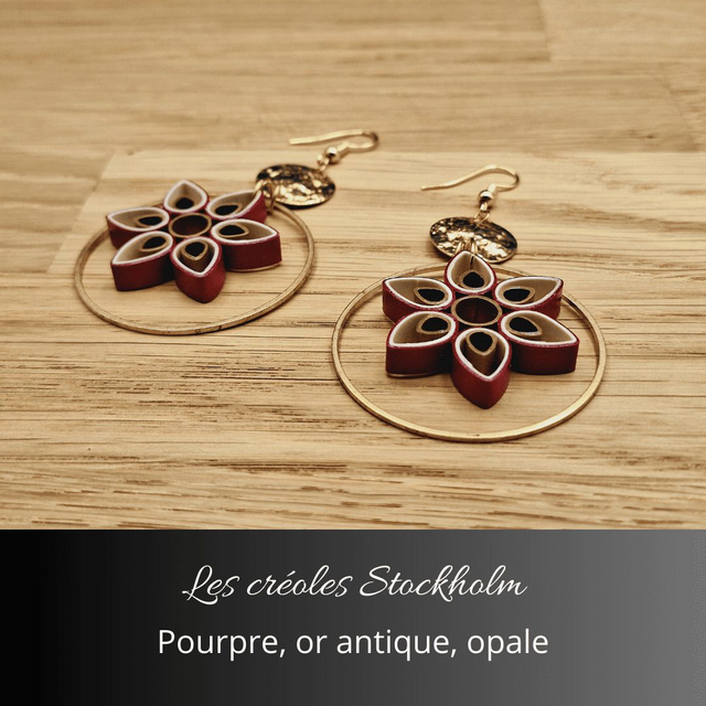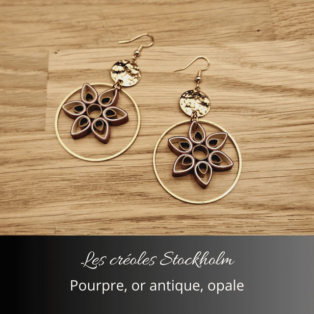 Découvrez les créoles Stockholm, un bijou plein de raffinement et de charme. Ces boucles d’oreilles se distinguent par leur design floral minutieusement travaillé, mariant les teintes élégantes de pourpre, or antique et opale. Chaque élément est finement assemblé, créant un équilibre parfait entre modernité et style intemporel.