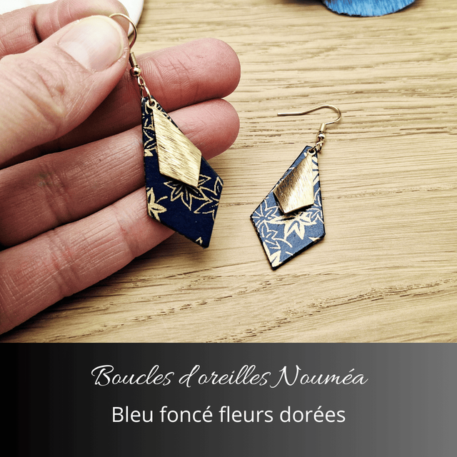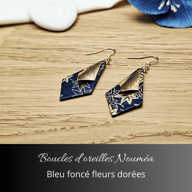 Boucles d'oreilles Nouméa - Bleu foncé fleurs dorées